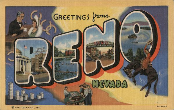 I am designing marriage-annoucement postcards for friend’s who just eloped in Reno. They want a 1950’s travel postcard feel, something a little kitschy, like this postcard.