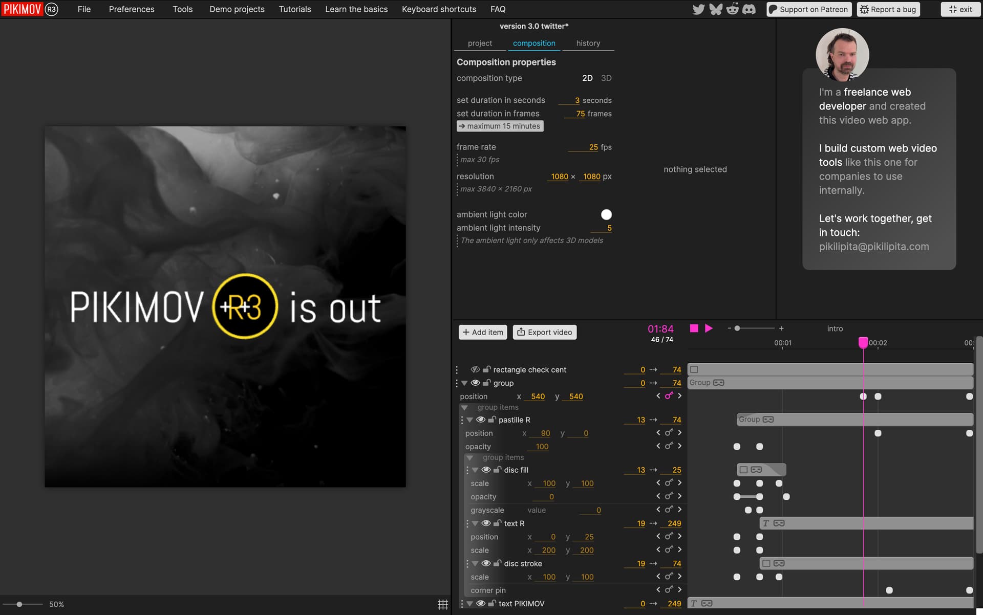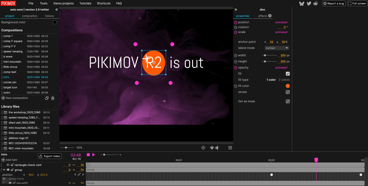 I’m pleased to introduce you Pikimov, a free web-based motion design tool: https://pikimov.com
