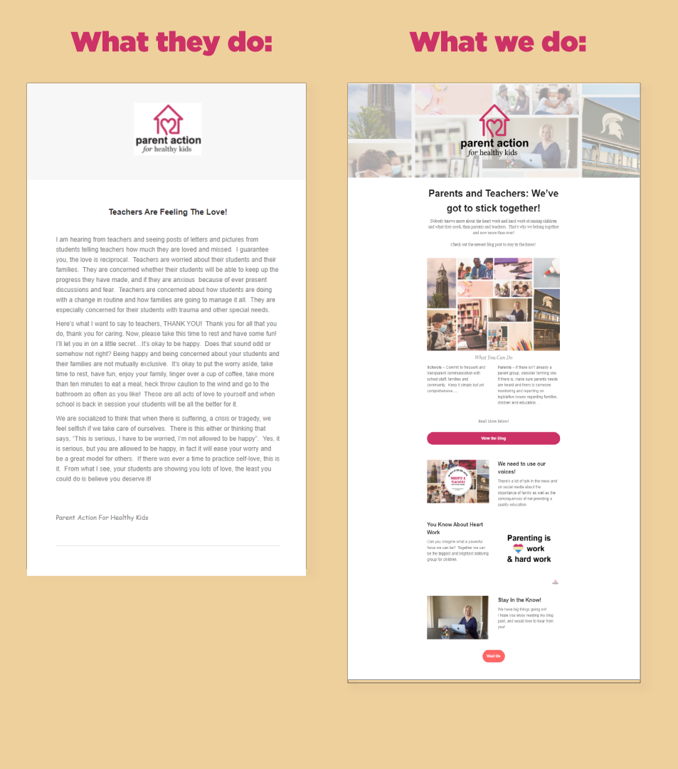 Under the previous lady, her email marketing was 360ish clients | 40-57 email opens | >1% site traffic (a click or so)