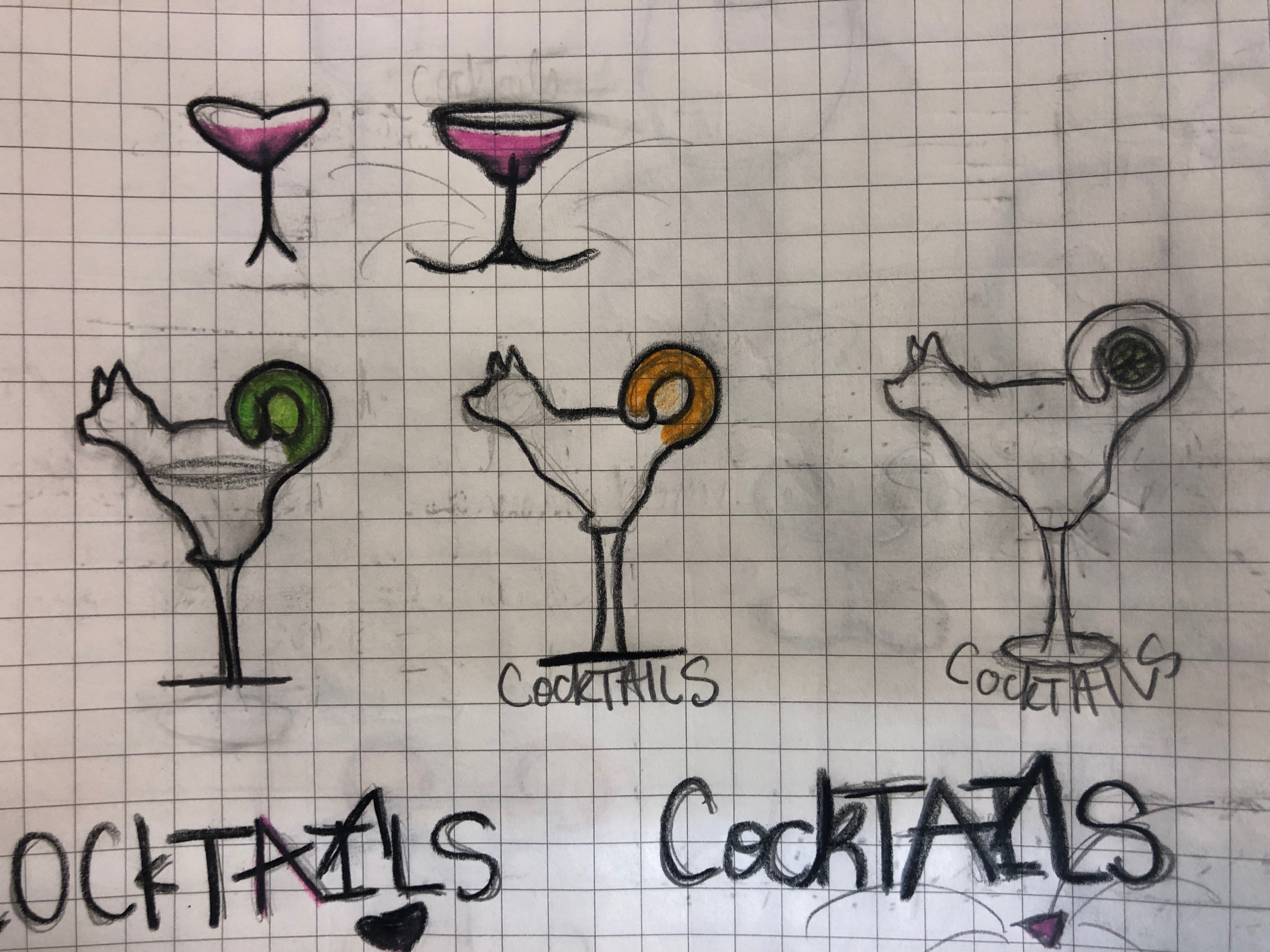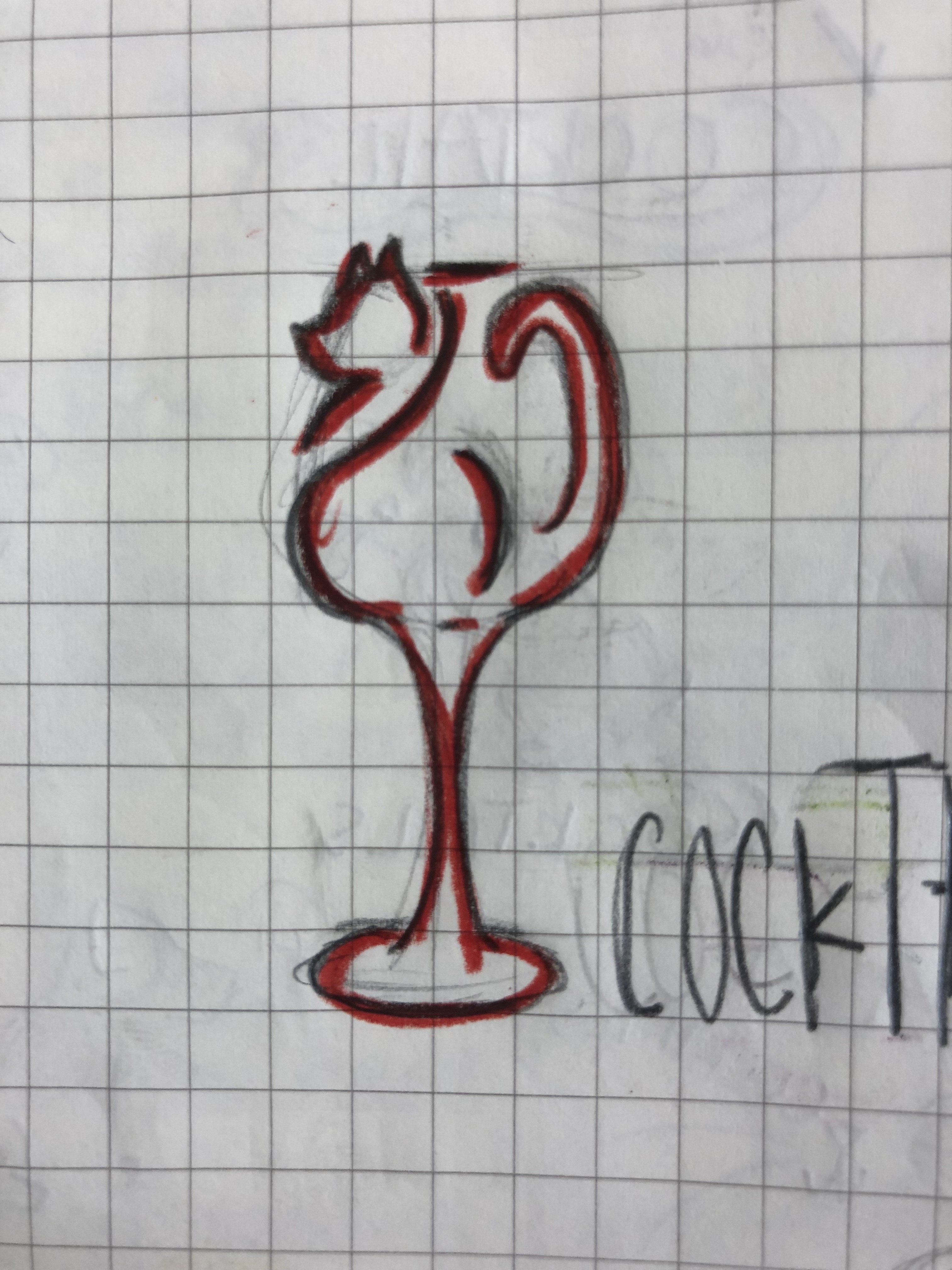 I had some other designs sketched out with cats and dogs, however, those didn’t have strong concepts to go with the company. The cat sketches were much more fluid and easier to manipulate with the cocktail glasses since cats are so much more flexible. I had some suggestions to change the company’s products to strictly cat products because of this (which I’m leaning towards).