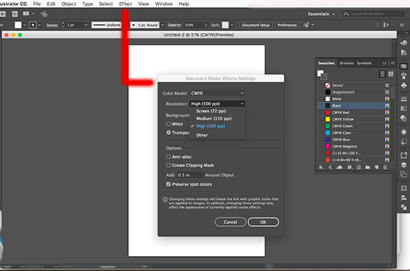 For instance, if your final piece is 100% and your output resolution is 300ppi, then it should look like the image above. If you are going to output at 200%, then your RES should be 600ppi (apply under other,) because when you double the size in the layout program, you halve the resolution, just like with images.