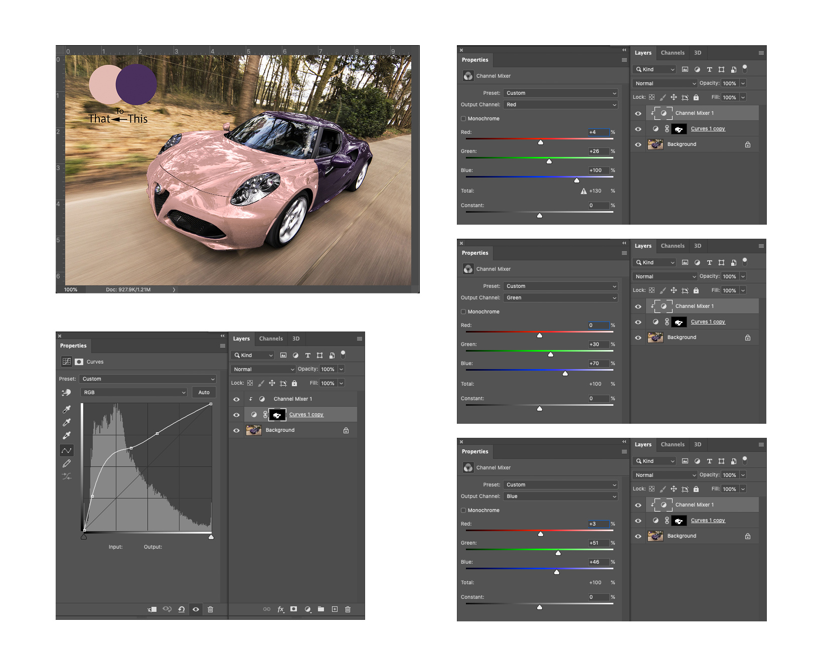 • Try to keep each channel’s total value at 100, going under could change your images white point and going over could blow out your brights.