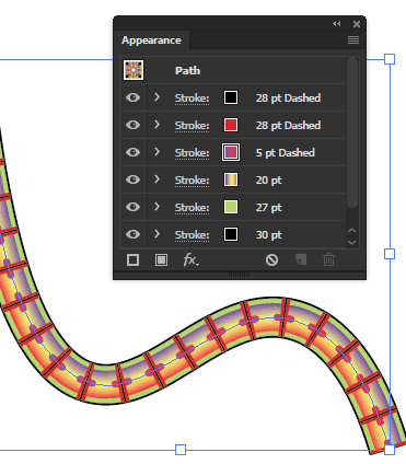 My first infatuation with it came about after reading a forum thread about making realistic looking roads on a map/directory of some park or campusâthe kind that looks like an illustrated aerial view. A respondent demonstrated how it could be done by using the Appearance panel to stack up strokes of varied color and weight on a single path.
