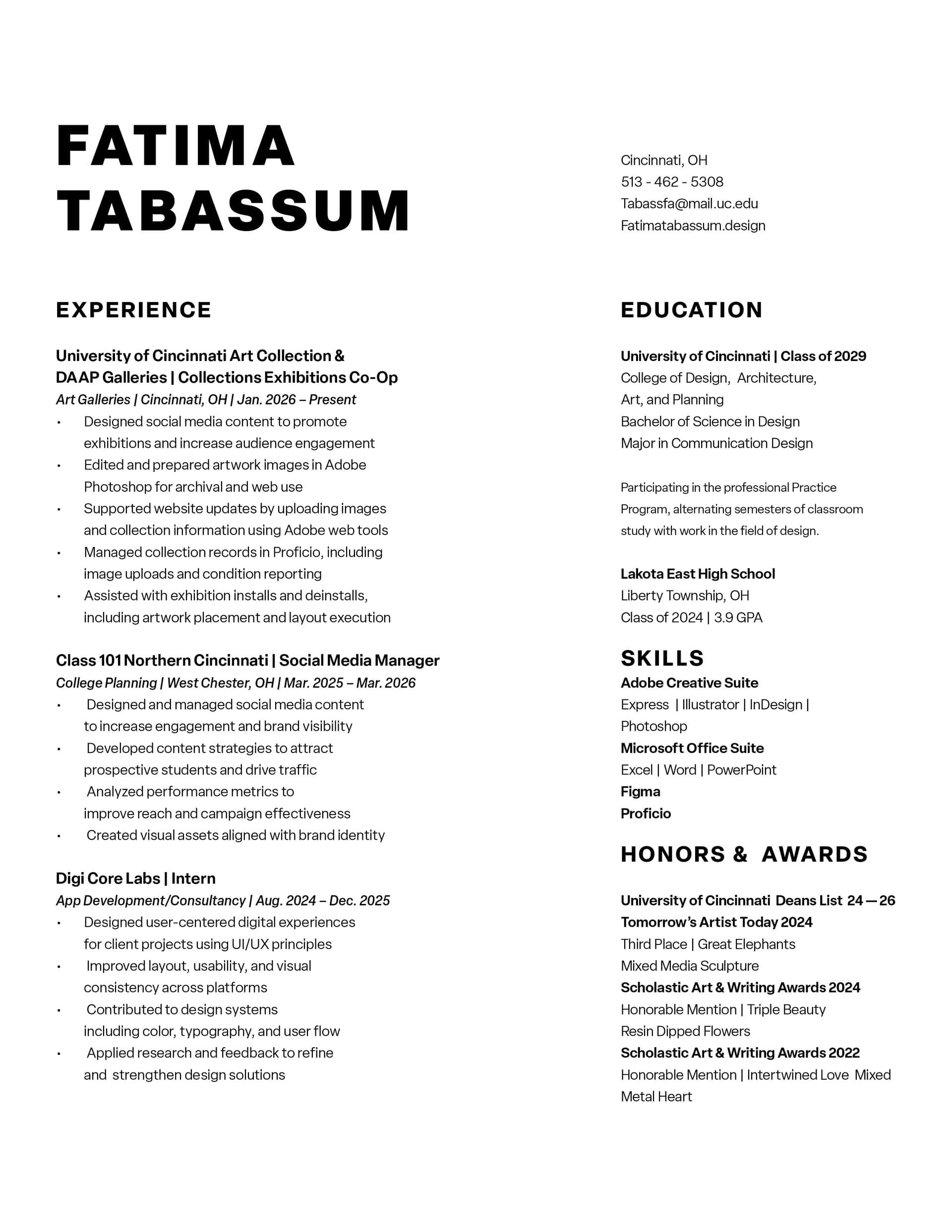Hi Everyone! This is my first post, I wanted to upload my resume and get any critiques. I am a second year graphic design student and have been applying to co-ops/internships but I’ve had difficulty figuring out if my resume is good as we need it to be designed well but also have it be ats approved for companies. I am trying to secure a job at a bigger company and get a job as a traditional designer but I feel my work might be lacking. I am still updating my portfolio which is on my resume but ill try to link it, i am open to critiques and suggestions on how I can improve my portfolio as well! Thank you!